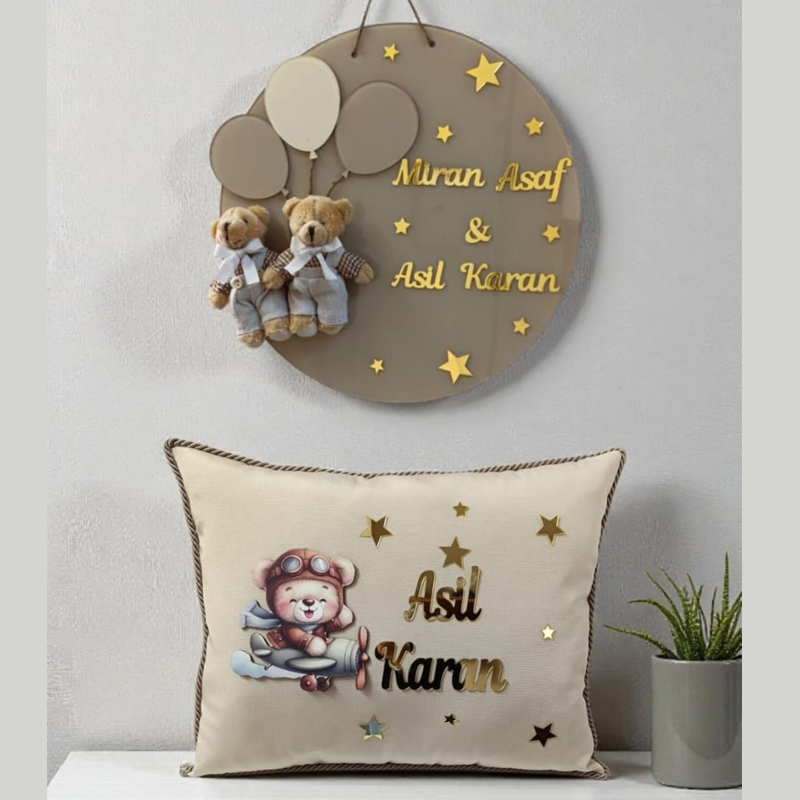 İki ayıcıklı bebek  kapı süsü ve takı yastığı takımı..