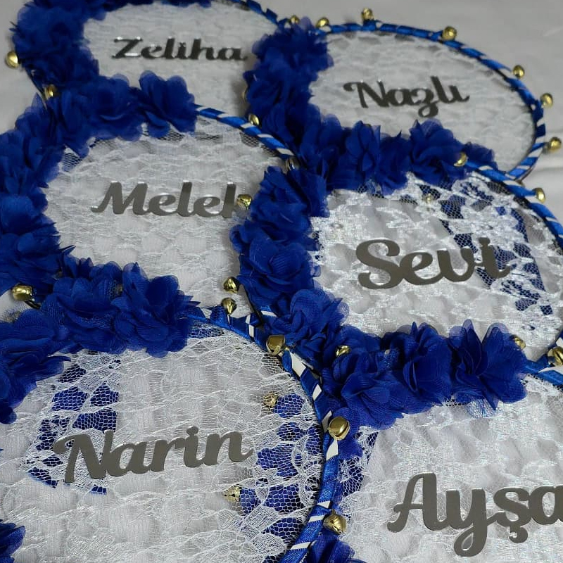 Kına gecesi için geline ve nedimelere özel isimli, dantelli ve lazer kesim çiçekli tef, istediğiniz renk çiçeklerle hazırlanabilmektedir..